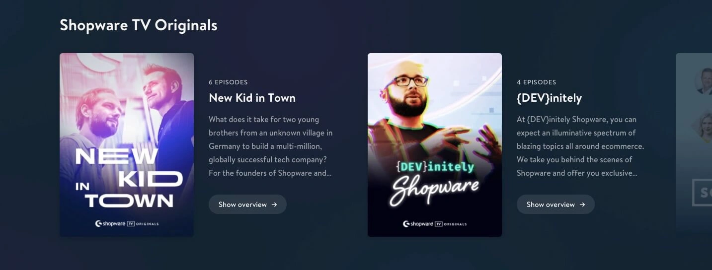 Shopware TV ist ein kostenloser Streaming Dienst. Infotainment rund um E-Commerce Themen. Die Serien sollen informativ und unterhaltend gleichzeitig sein und sind alle auf Englisch.