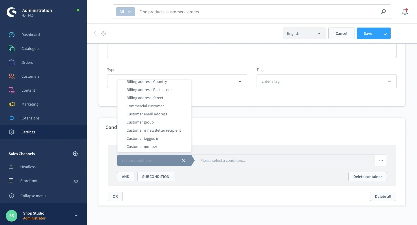These can be linked to some conditions, for example: Different addresses, number of orders, number of basket goods, manufacturer, novelties, position of the type. There are several more conditions available. Just click through to the Rule Builder to see all the possibilities..