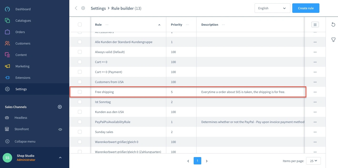 Clicking on the Rule Builder opens an overview with all the rules created so far. The columns you see here provide you with a lot of information about these rules, the columns are:**Name of the rule, Description of your rule, Priority, Creation date and Status. **Now you might ask yourself what this means for one or the other field. For this reason, we will now briefly explain what is meant by these fields.**Name: **What did you name your rule?**Description: **Your own description. What does this rule do?**Priority: You set when your rule will be applied. The numbers count in ascending order. The higher the number, the sooner the rule will be applied. For example, a rule with priority 5 is executed before a rule with priority 3. If the priority of the other rule is 7, it will be executed afterwards. ****Creation date: **the date when the rule was created.**Status: **Valid or Invalid. Indicates whether the rule has errors. If so, it is invalid and cannot be executed.