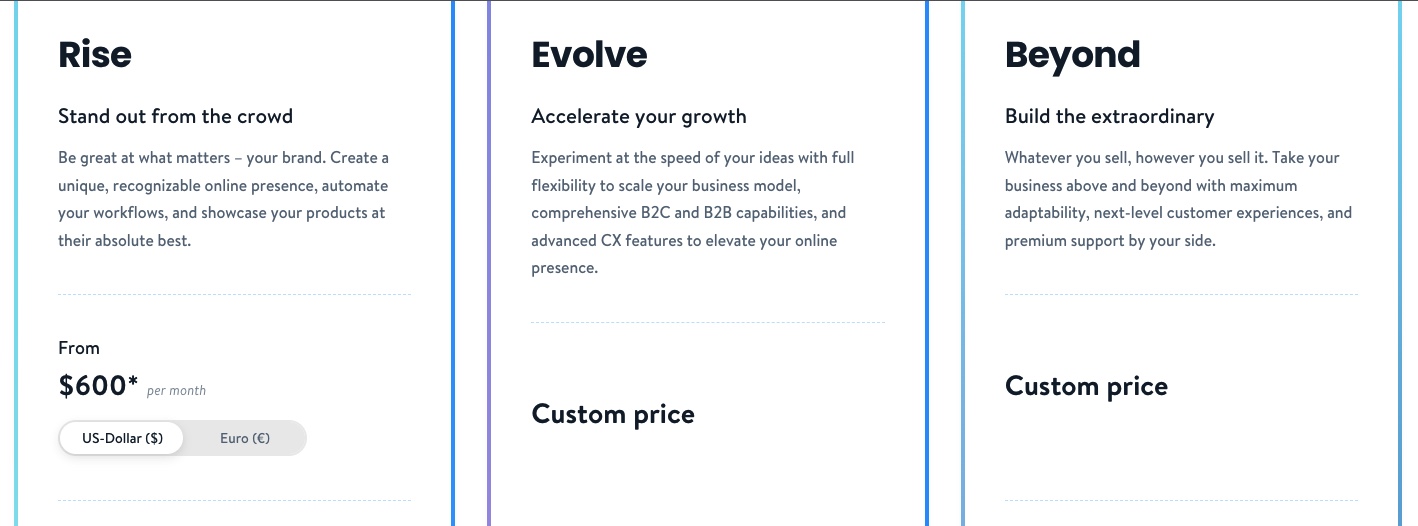 Die Rise Edition kostet monatlich 600€. Bei dieser Edition kommt zum Funktionsumfang der Starteredition Folgendes dazu: Individualisiertere Produkte, Herstellersupport, die Möglichkeit der Workflow Automatisierungen, Inventar & Bestellverwaltung, B2B Funktionalitäten und Contentmanagemangt.