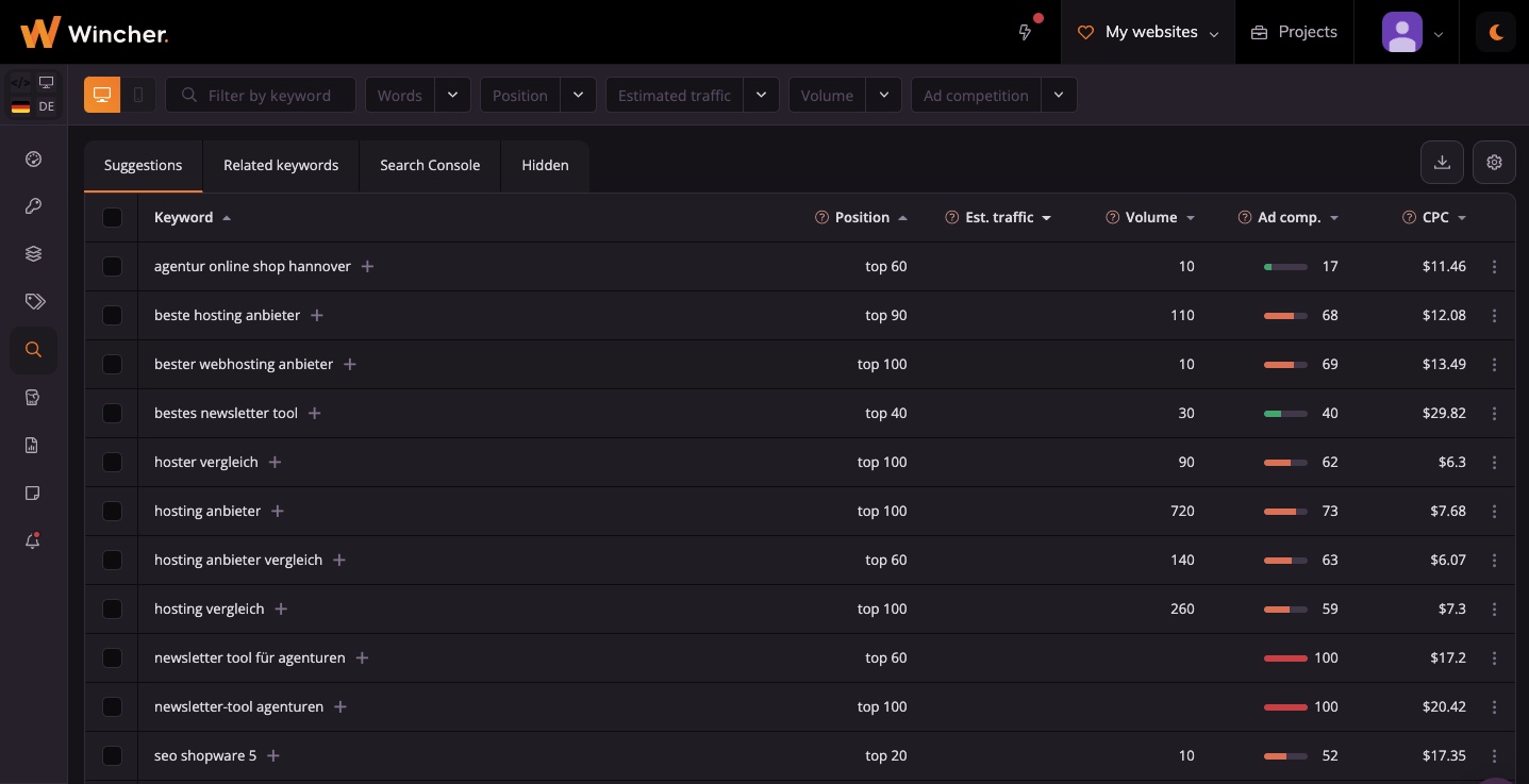 Wincher is an SEO tool that allows you to monitor the effectiveness of your keywords in search results. The tool allows you to create a list of keywords and regularly monitor their position in search results. The position of your keywords in search results is an important indicator of your website's visibility and has a significant impact on your traffic.