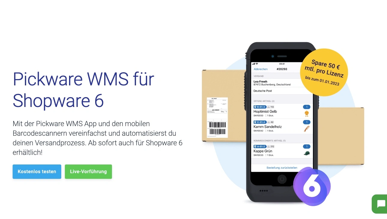 What we have not mentioned so far: To use Pickware WMS, you need Pickware ERP. You can download Pickware ERP from the Shopware Shop. Pickware WMS, on the other hand, can be purchased directly from the Pickware homepage.